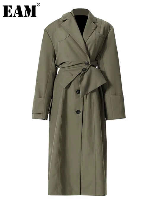 [] Women Green Irregular Big Size Trench New Lapel Long Sleeve Loose Fit Windbreaker Fashion Tide Spring Autumn 2026 1DE2795